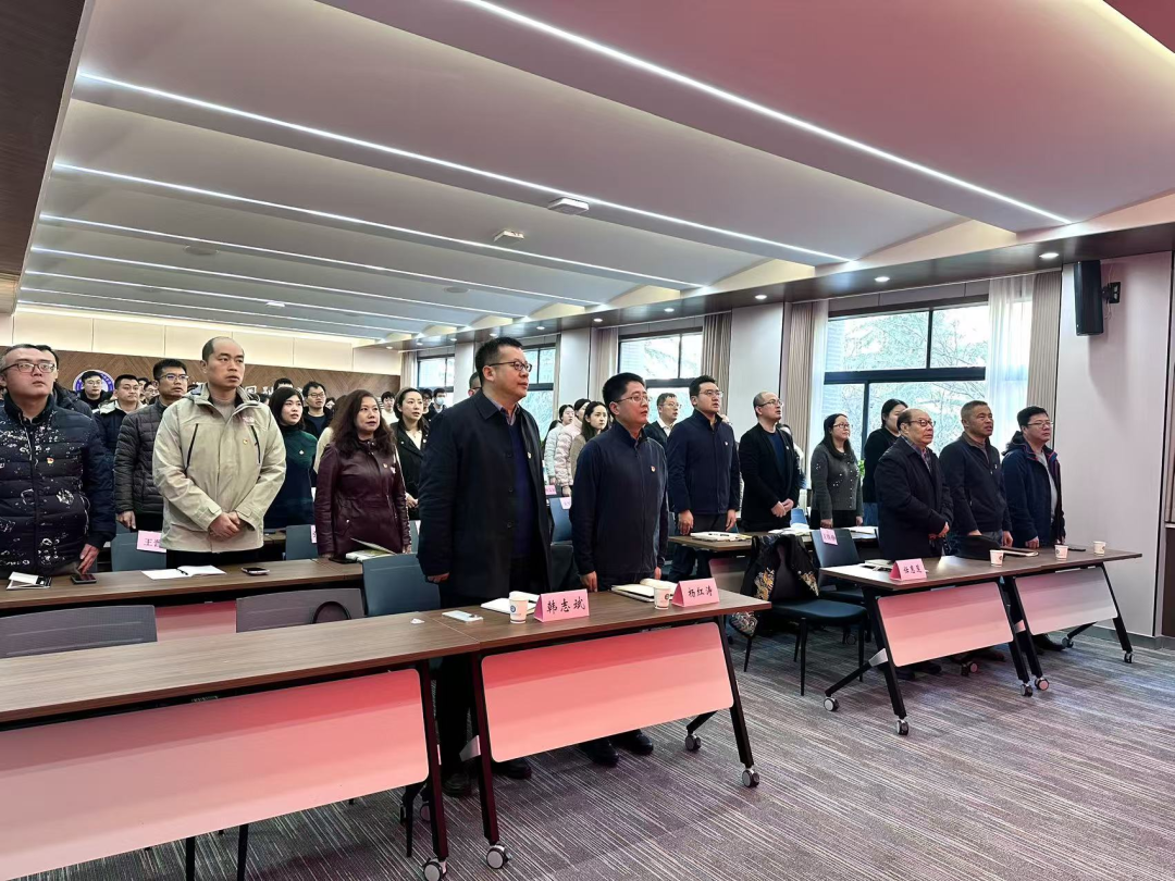 大会在庄严的《中华人民共和国国歌》中拉开帷幕,全体参会人员起立奏唱国歌。