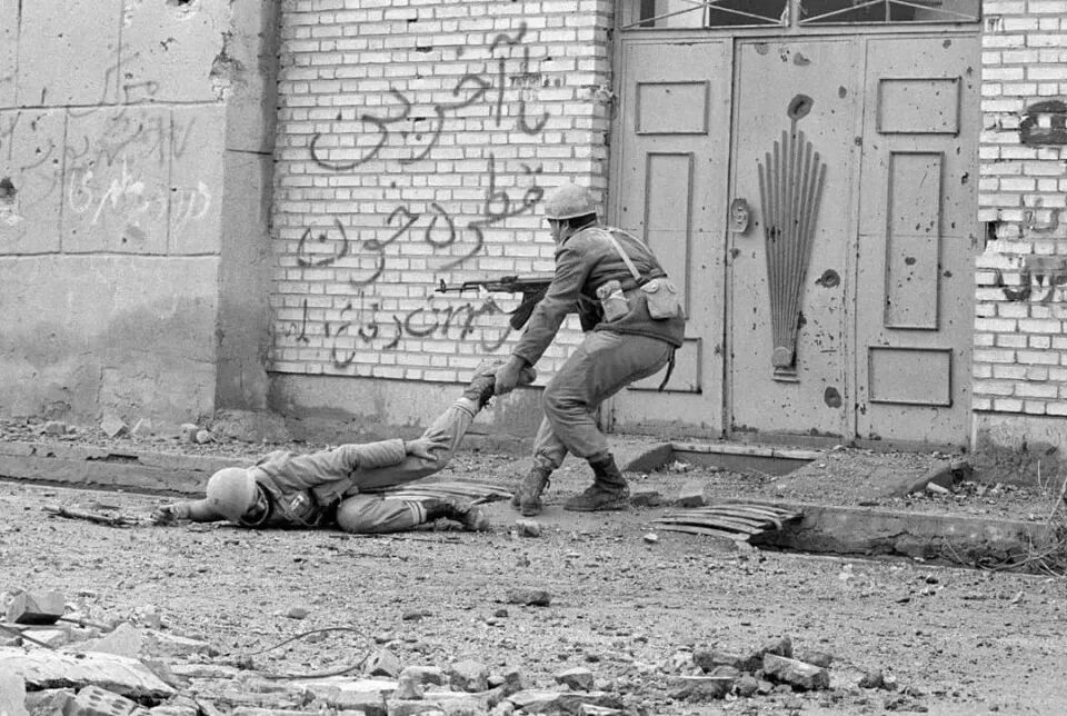 图源网络:两伊战争期间,一名伊朗士兵正在救助受伤战友。墙上用波斯语写着:“我们将誓死捍卫祖国,直到流尽最后一滴血”。