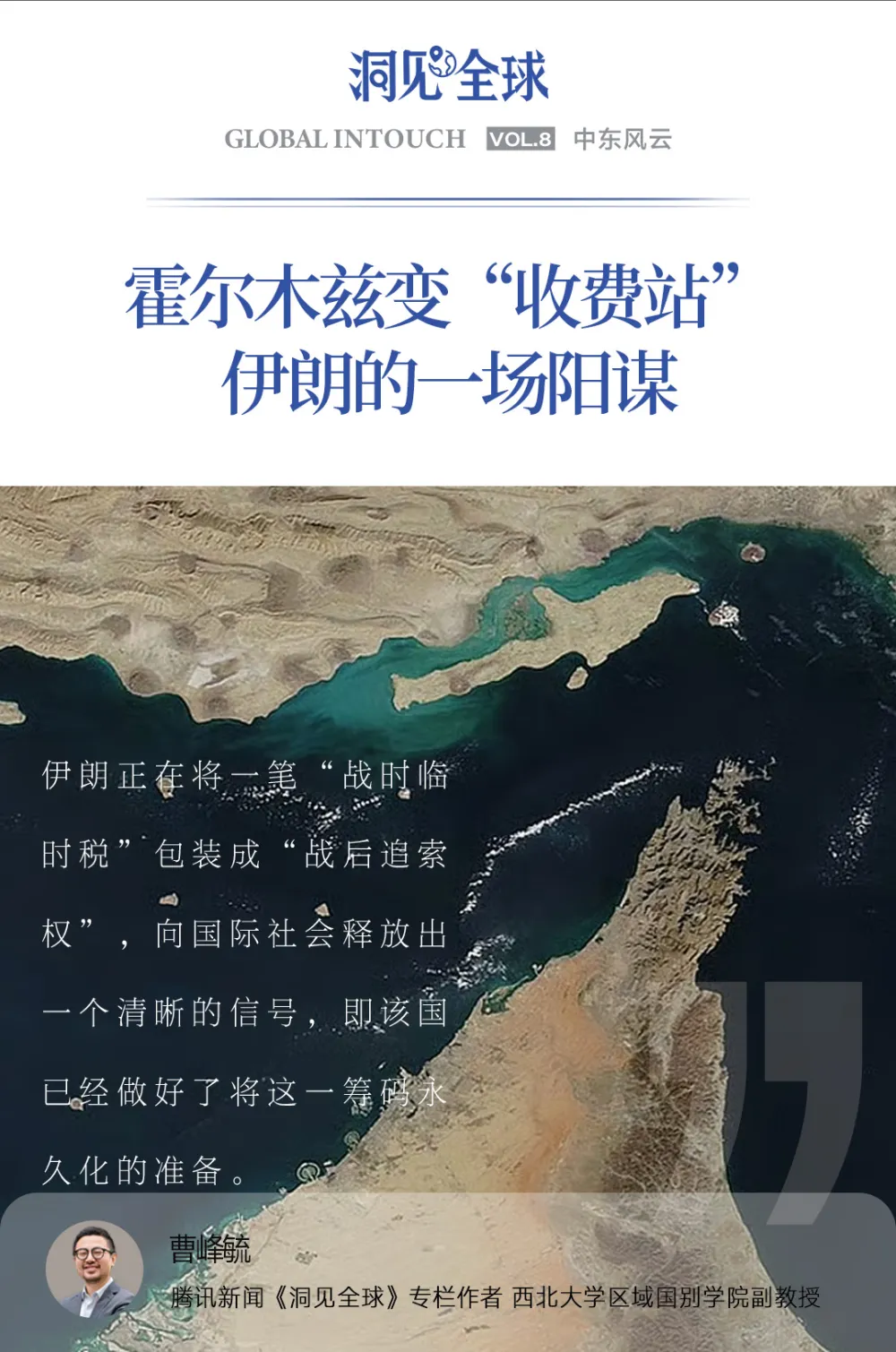 编者按:2026年4月12日,据央视新闻最新消息,美伊在巴基斯坦的谈判无果而终。美国总统特朗普威胁控制霍尔木兹海峡,禁止伊朗油轮进出。此前,伊朗宣布要对霍尔木兹航道“设卡收费”,一场围绕全球能源命脉的博弈悄然升级。本期《洞见全球》邀请到西北大学区域国别学院 曹峰毓副教授,深度拆解“收费站”背后的地缘逻辑,看伊朗如何用一把“商业软刀”,撬动大国博弈的天平。