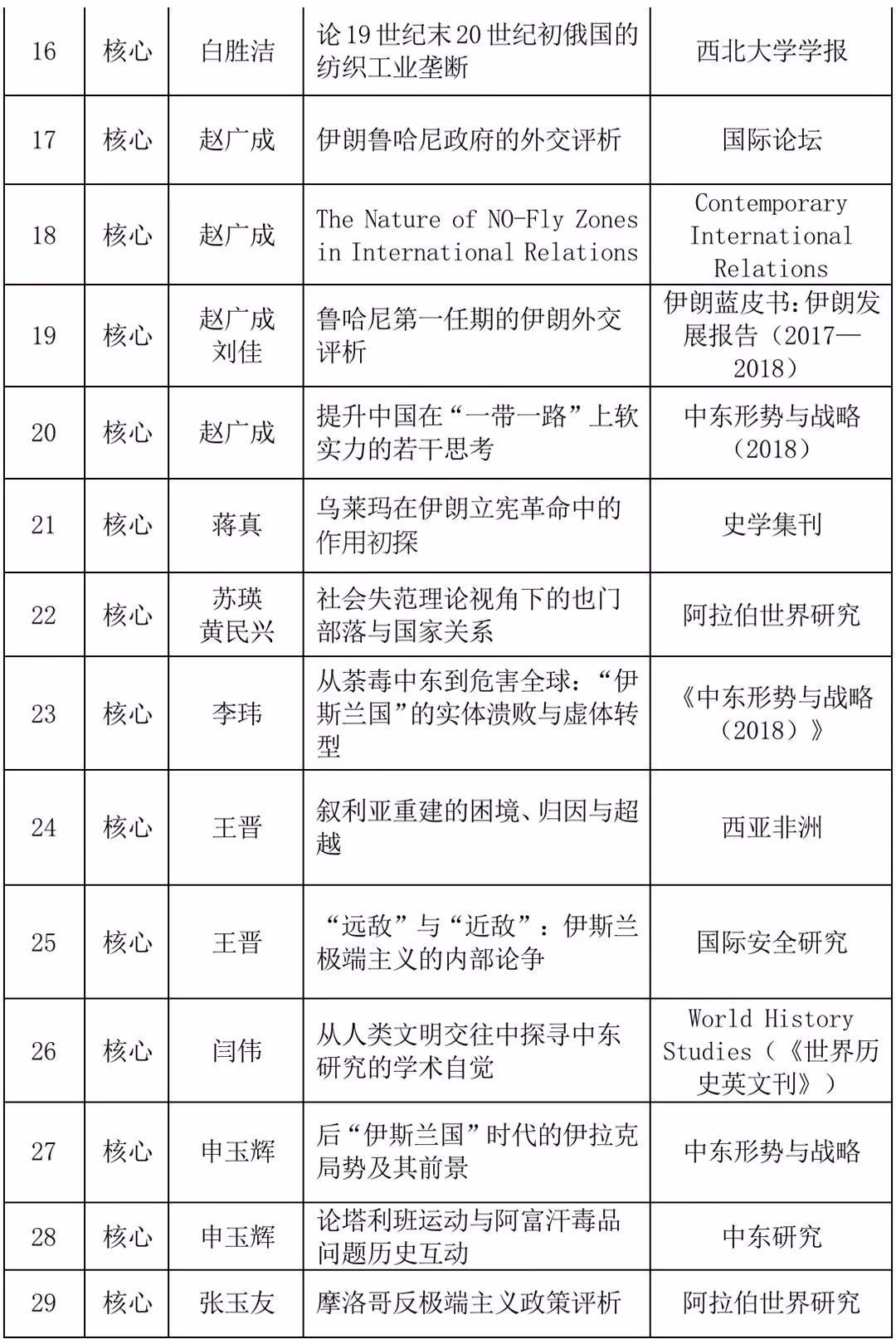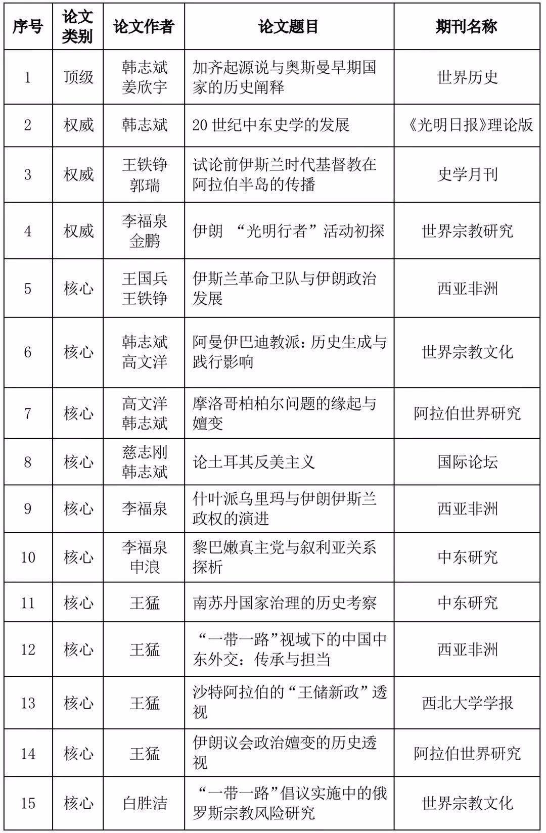 2019年,在《世界历史》《世界宗教研究》《史学集刊》《国际论坛》《西亚非洲》《西北大学学报》《世界宗教文化》《国际安全研究》《文化纵横》《阿拉伯世界研究》等国内外知名刊物发表学术论文41篇,其中顶级期刊1篇,权威期刊3篇,核心期刊25篇。