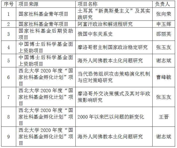 2019年,中东研究所获批国家社科基金青年项目、后期资助项目共3项,立项率高达75%。另获批中国博士后科学基金面上资助项目2项,其他项目4项。荣获西北大学2019年国家社会科学基金先进集体二等奖。