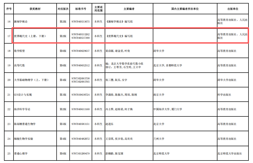 近日,教育部发布《关于第二届全国教材建设奖拟奖励名单的公示》,西北大学区域国别学院黄民兴教授作为首席专家撰写的《世界现代史(上、下册)》荣获“第二届全国教材建设奖(高等教育类)一等奖”。