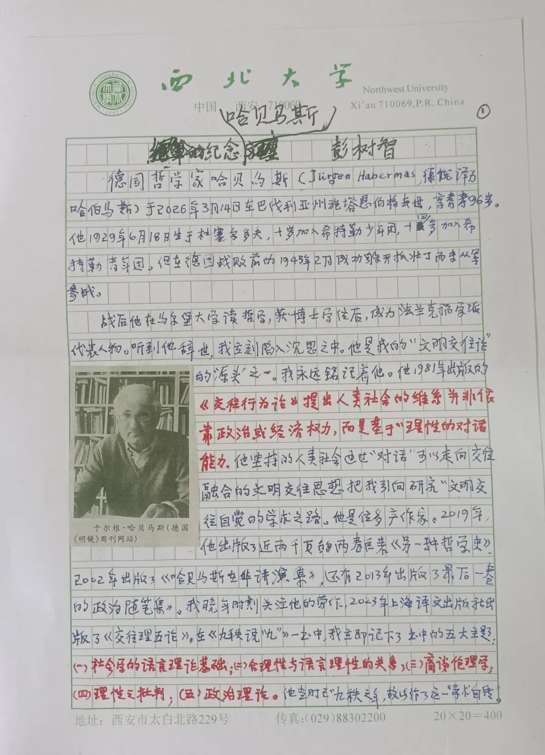 战后,哈贝马斯在马尔堡大学读哲学,获博士学位后,成为法兰克福学派代表人物。听到他辞世,我立刻陷入沉思之中。他是我的“文明交往论”的“源头”之一,我永远铭记着他。哈贝马斯1981年出版的《交往行为论》提出人类社会的维系并非依靠政治或经济权力,而是基于“理性的对话”能力。他坚持的人类社会通过“对话”可以走向交往融合的文明交往思想把我引向研究“文明交往”自觉的学术之路。哈贝马斯是位多产作家。2019年,他出版了近2000页的两卷巨著《另一种哲学史》;2002年出版了《哈贝马斯在华讲演集》,还有2013年出版了最后一卷的政治随笔集。我晚年时刻关注他的劳作,2023年上海译文出版社出版了《交往理性五论》。在《九秩说“九”》一书中,我立即记下了书中的五大主题:(一)社会学的语言理论基础;(二)合理性与语言理性的关系;(三)伦理学;(四)理性之批判;(五)政治理论。他当时已九秩之年,故此作了这一“学术自传”。
