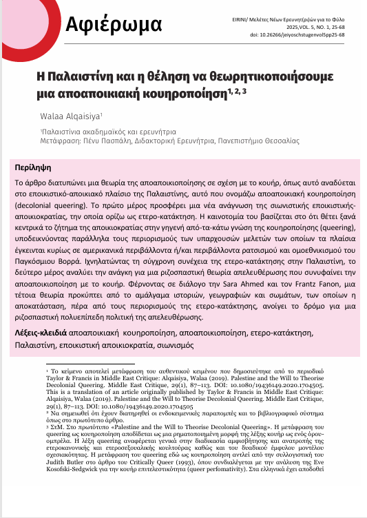婉澜博士(Walaa Alqaisiya)的文章《巴勒斯坦与去殖民化理论的审思》(Palestine and the Will to Theorise Decolonial Queering),被希腊《艾里尼人类学期刊》(Eirini Anthropological Journal)以希腊语全文转载。该文发表在《中东批评》(Middle East Critique)2020年第1期,从巴勒斯坦定居者—殖民主义关系的背景出发,以性别政治为视角提出了一种去殖民化新的理论分析框架。《艾里尼人类学期刊》为塞萨洛尼基的马其顿大学、巴尔干斯拉夫与东方学系以及文化/边界/性别实验室的学者们发行的学术期刊,主要关注希腊的性别问题。