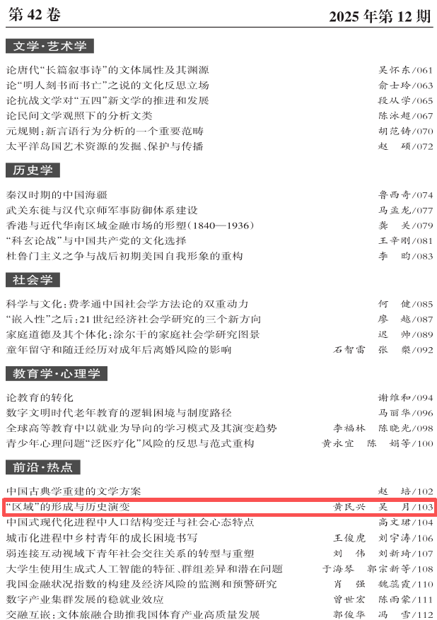 西北大学区域国别学院教授黄民兴、博士研究生吴月的文章《论区域国别学视域下“区域”的形成与历史演变》被《高等学校文科学术文摘》2025年第12期转载。原文刊发于《西北大学学报(哲学社会科学版)》 2025年第6期。