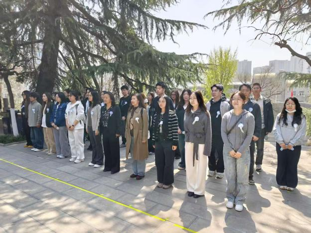 陵园内松柏苍翠挺拔,气氛庄严肃穆。全体师生整齐列队于碑亭前,向杨虎城将军纪念碑肃立致敬。任惠莲代表学院全体师生敬献花篮,随后全场垂首默哀、三鞠躬,深切缅怀为促进抗日民族统一战线建立做出重要贡献的杨虎城将军,表达对先烈的追思与敬仰。